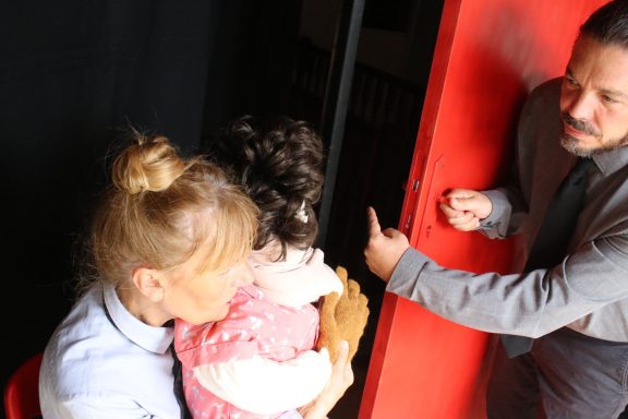 « Derrière la porte » a pour origine des témoignages d’assistantes sociales. C’est un spectacle de prévention. Notre parti-pris est de transposer les manifestations des violences sexistes et sexuelles aussi bien sur le lieu de travail que dans la vie quotidienne des victimes. Derrière la porte qu’elle soit fermée ou claquée, au bureau ou à la maison, il s’en passe des choses ! Au bureau ou à la maison, ce sont les mêmes mécanismes.